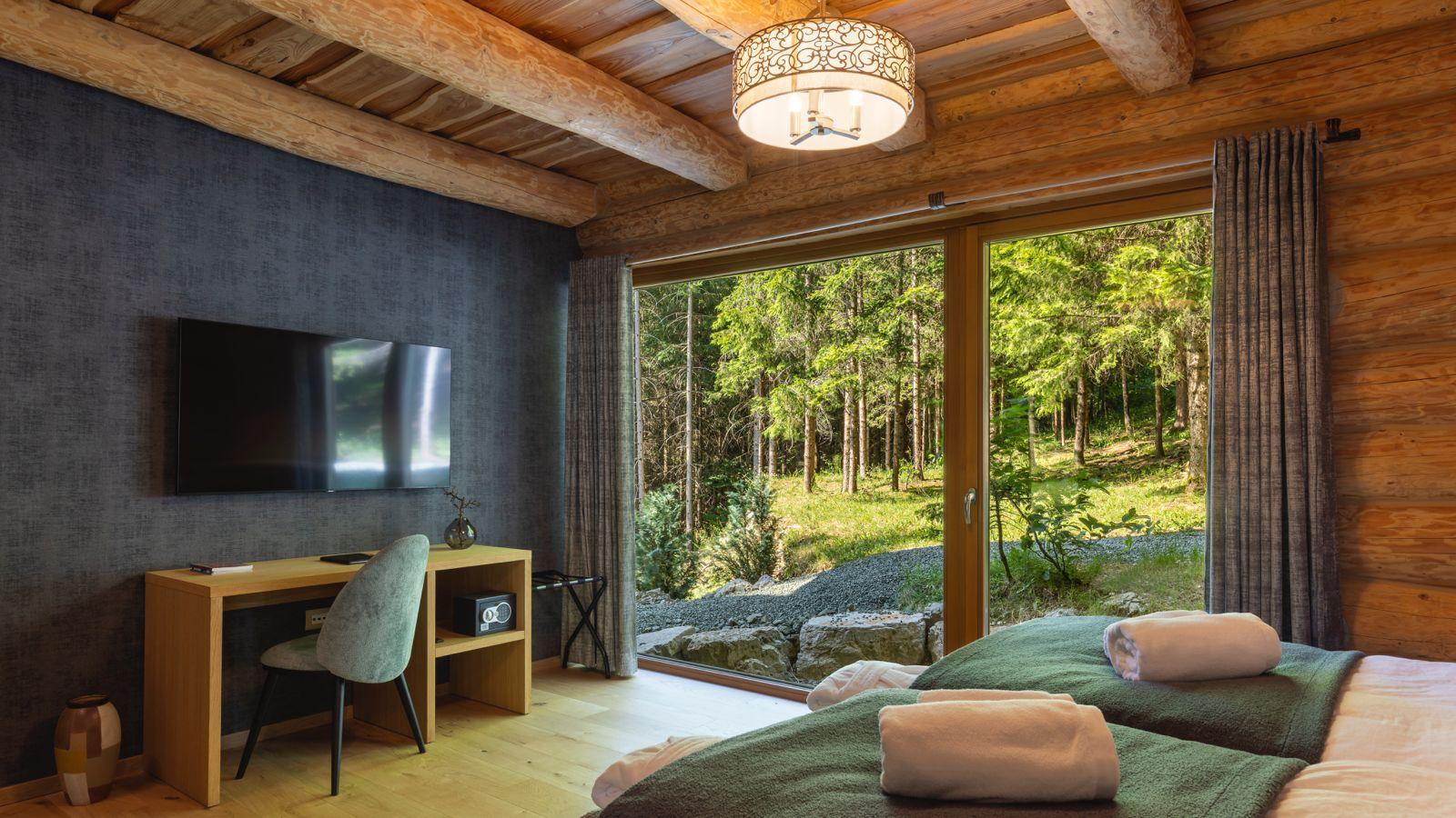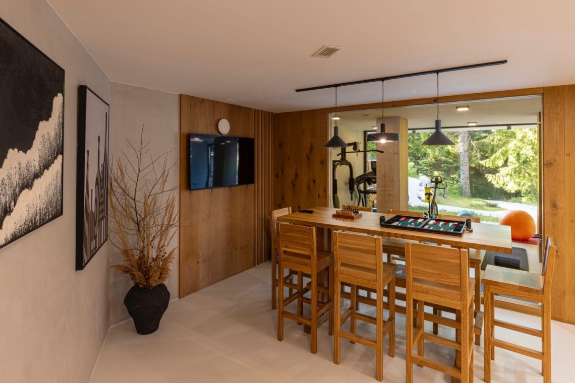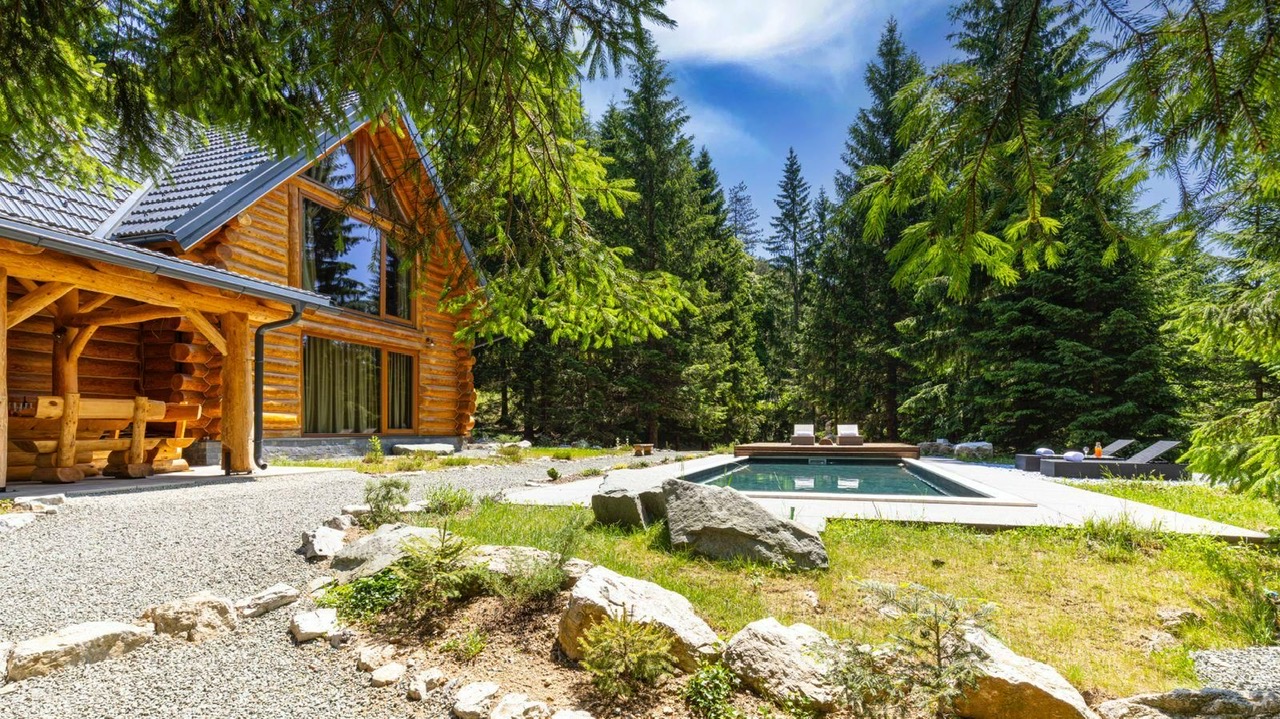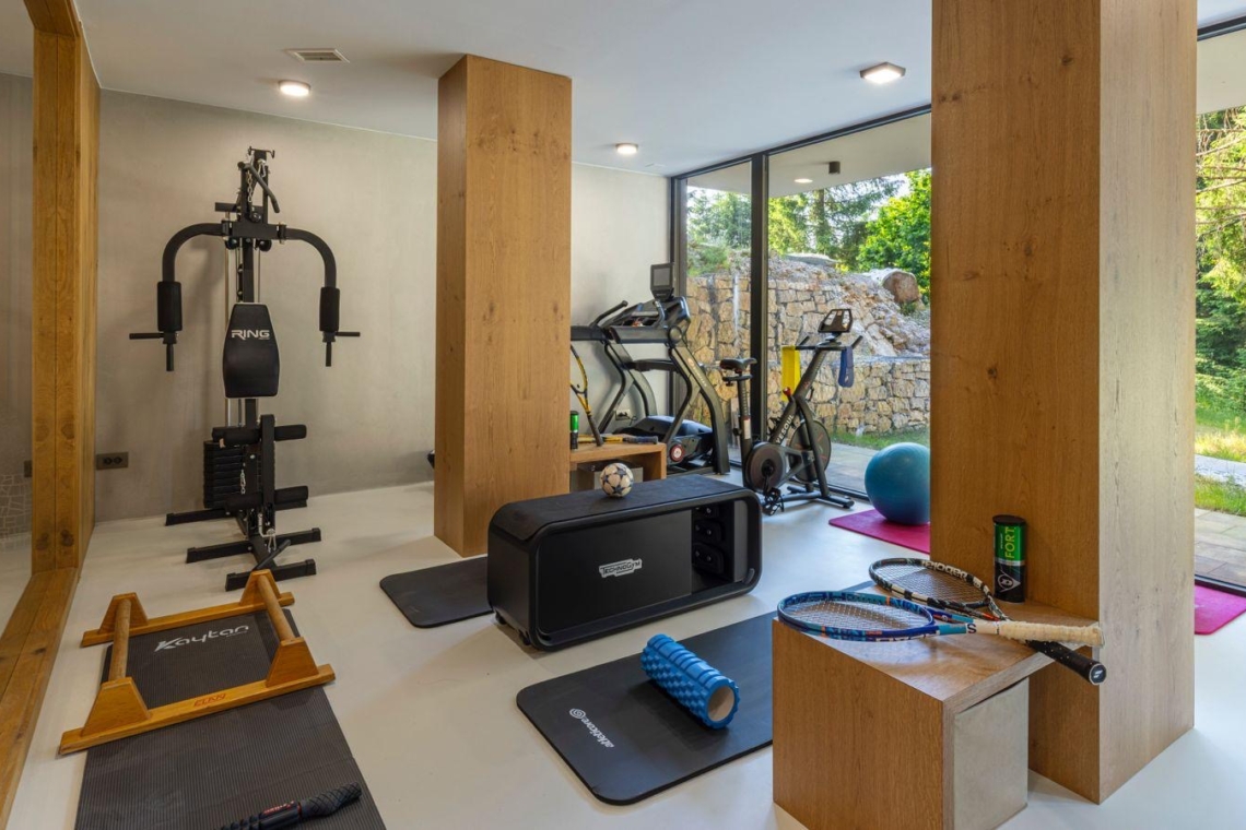 Guests can enjoy premium amenities such as a sauna, indoor jacuzzi, gym, billiards, wine cellar, PlayStation, piano, a spacious outdoor pool, and a private tennis court. Floor-to-ceiling glass surfaces provide stunning natural light and breathtaking views of the surrounding Gorski Kotar forest.
