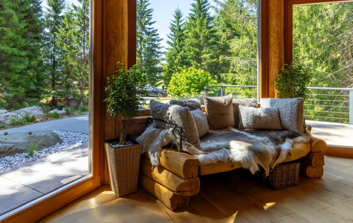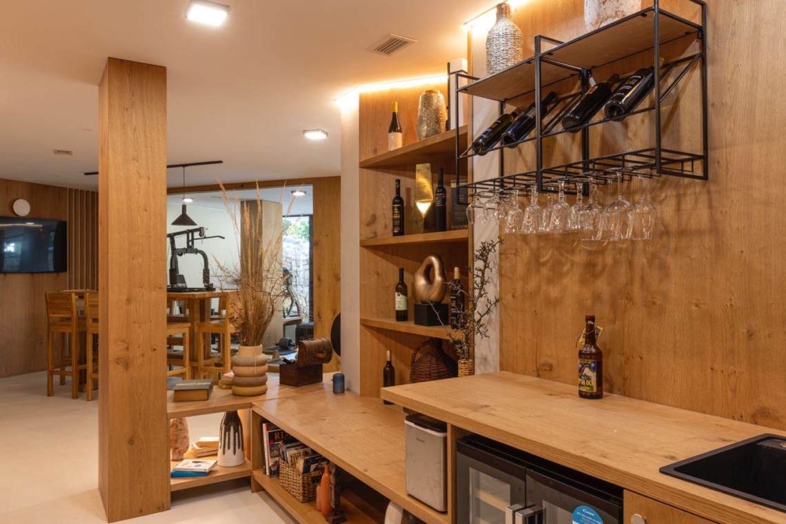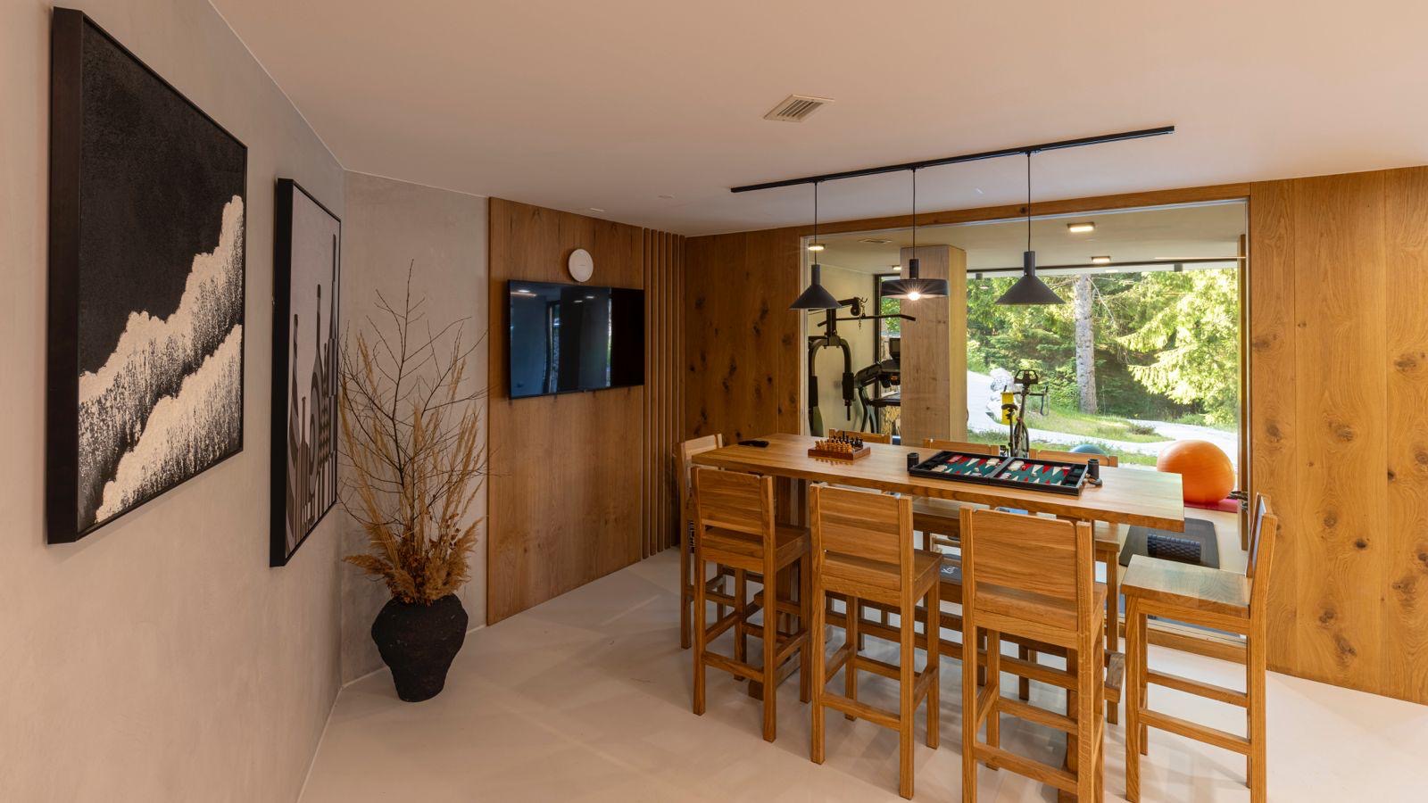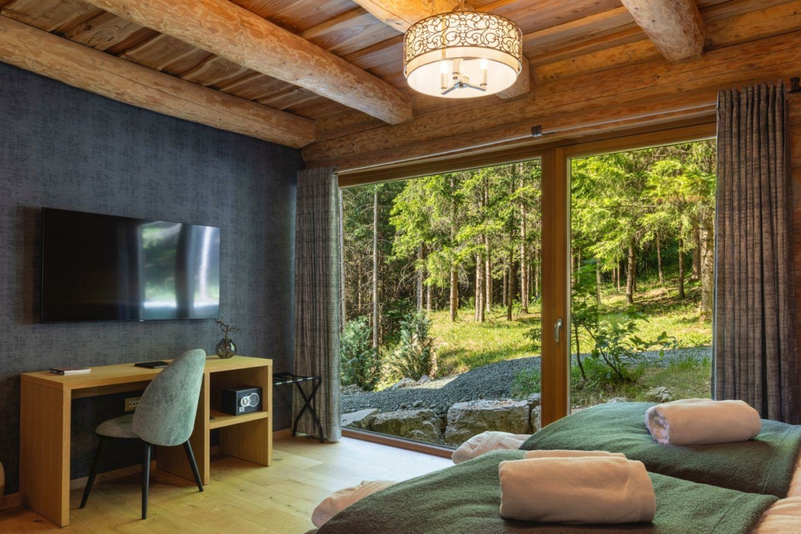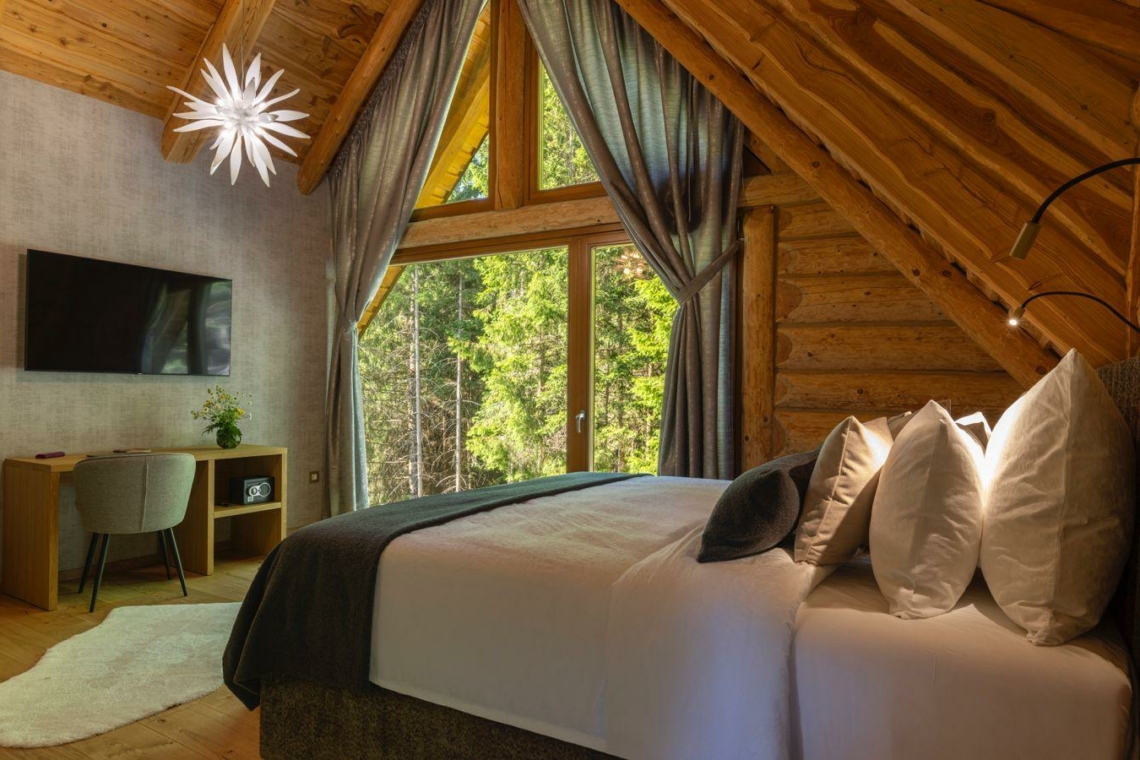 Guests can enjoy premium amenities such as a sauna, indoor jacuzzi, gym, billiards, wine cellar, PlayStation, piano, a spacious outdoor pool, and a private tennis court. Floor-to-ceiling glass surfaces provide stunning natural light and breathtaking views of the surrounding Gorski Kotar forest.