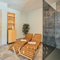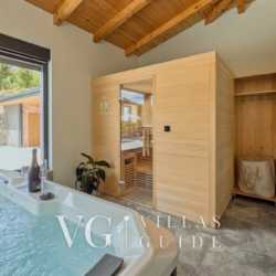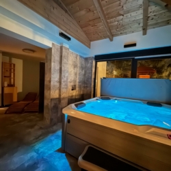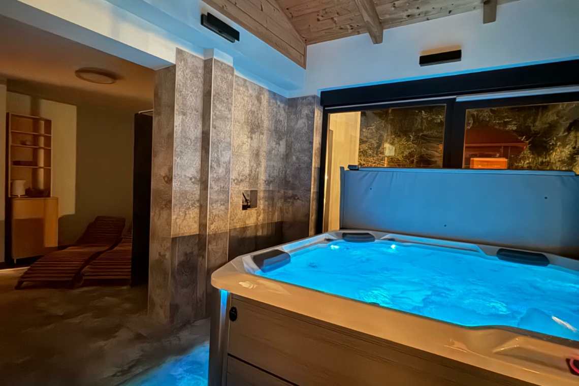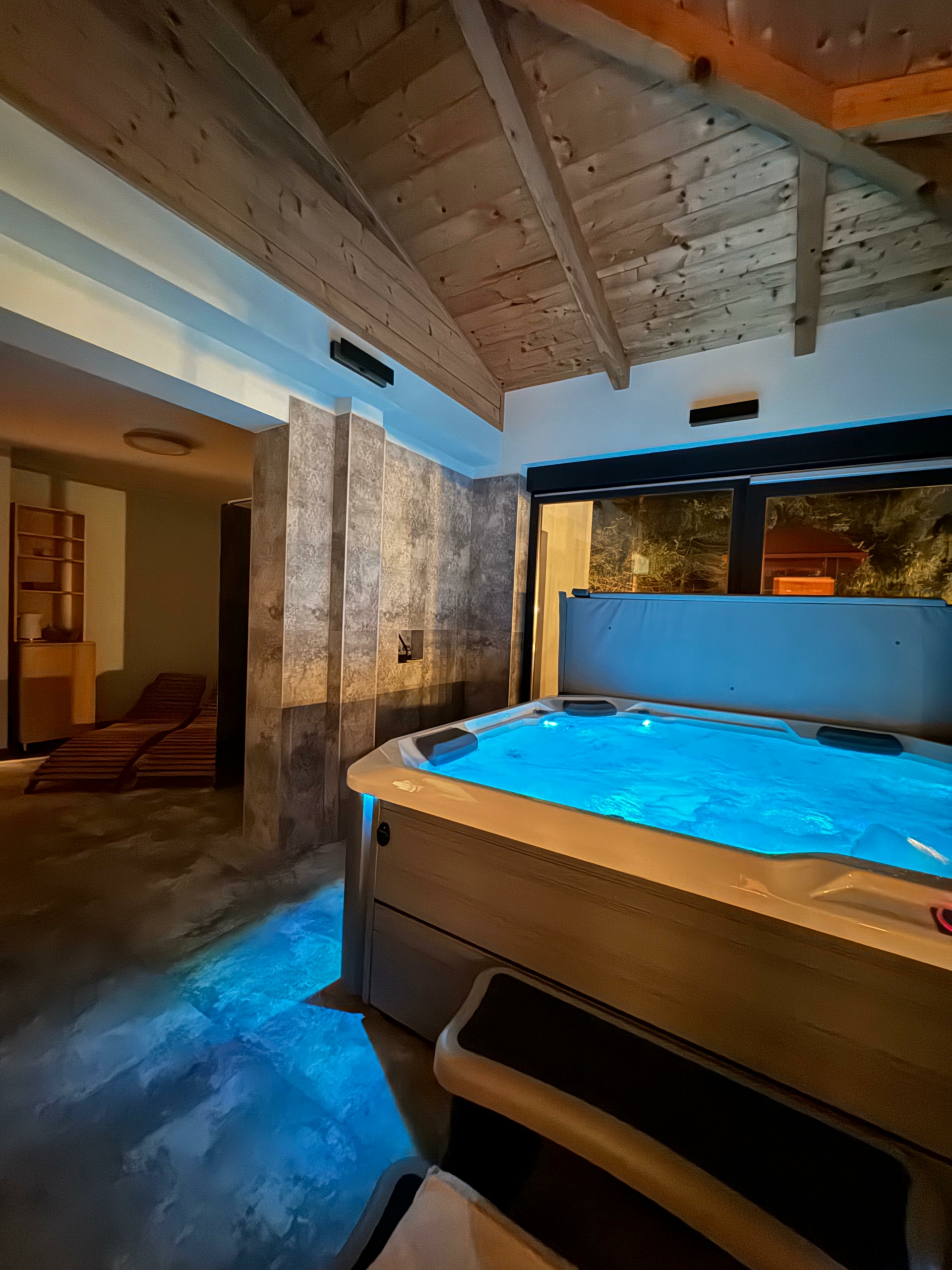 A standout feature is the indoor wellness area, which includes a Finnish sauna and a hydromassage hot tub for up to five people, offering the perfect setting for total relaxation.