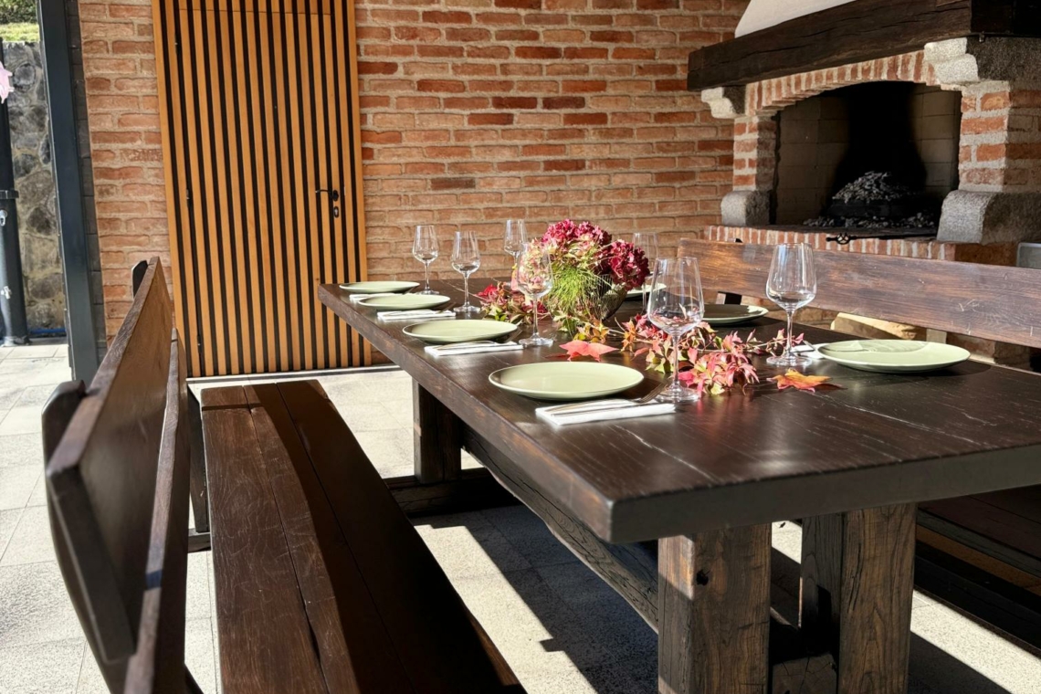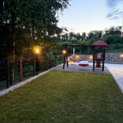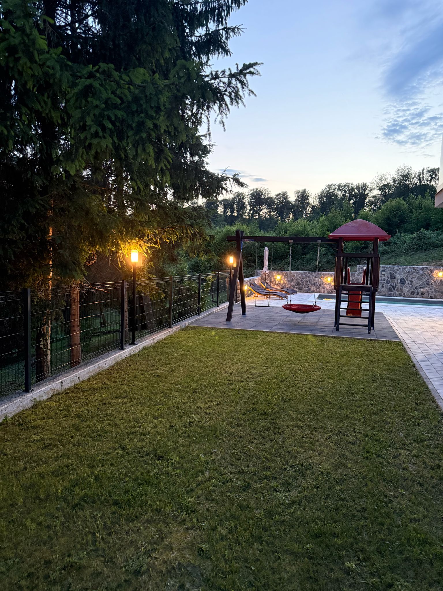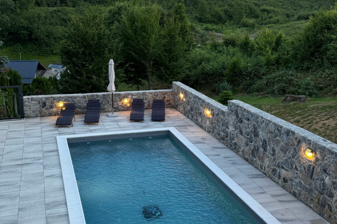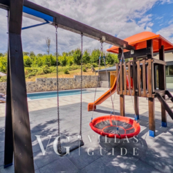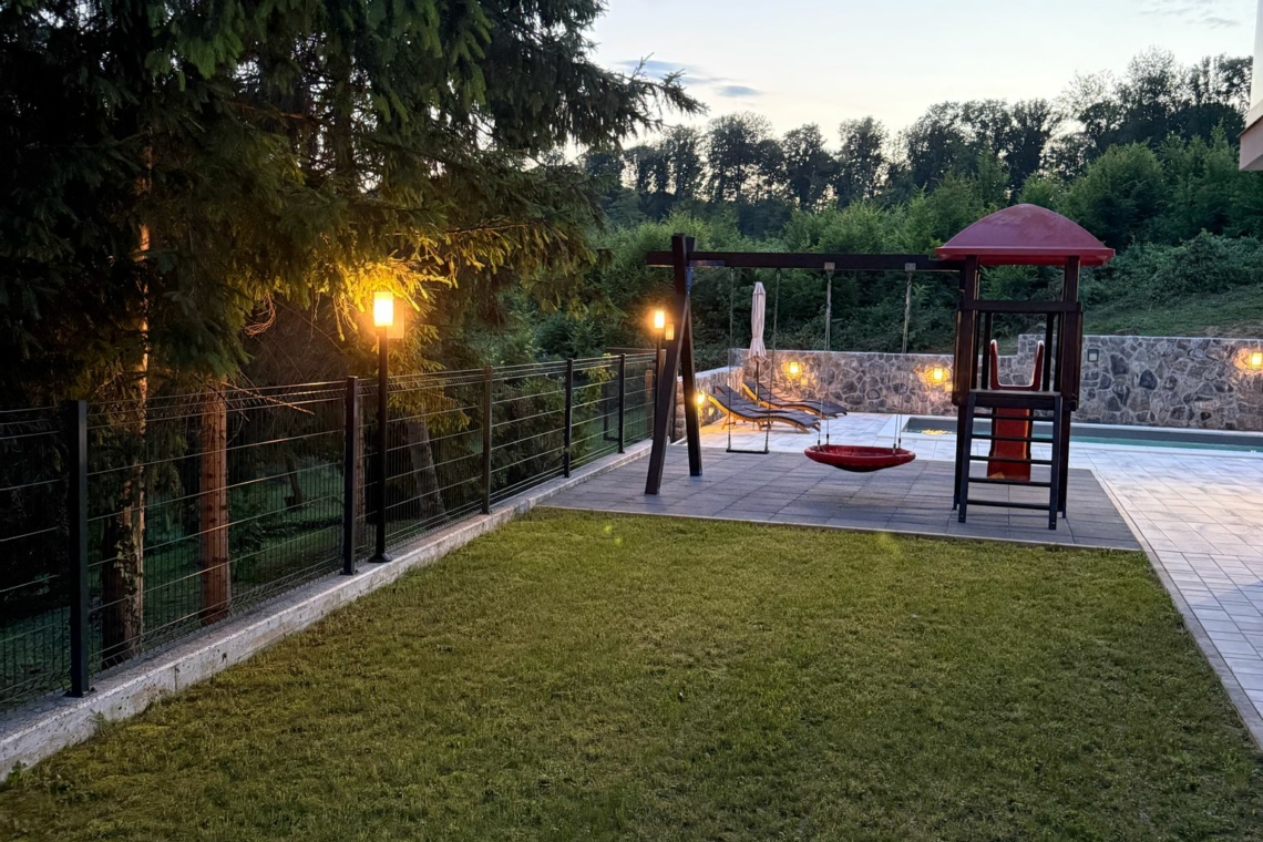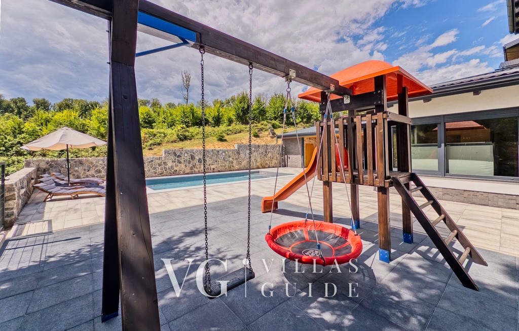 Outside, guests can enjoy a 32 m² private swimming pool, sun loungers, and scenic views of the surrounding greenery. Children will love the playground with a slide. The covered terrace with a wood-fired grill and summer kitchen is ideal for relaxing evenings.