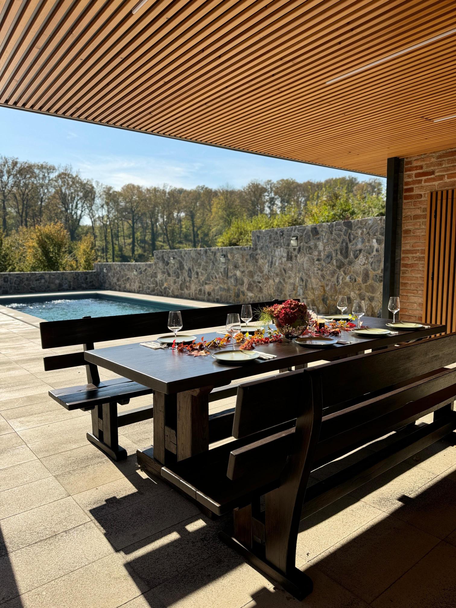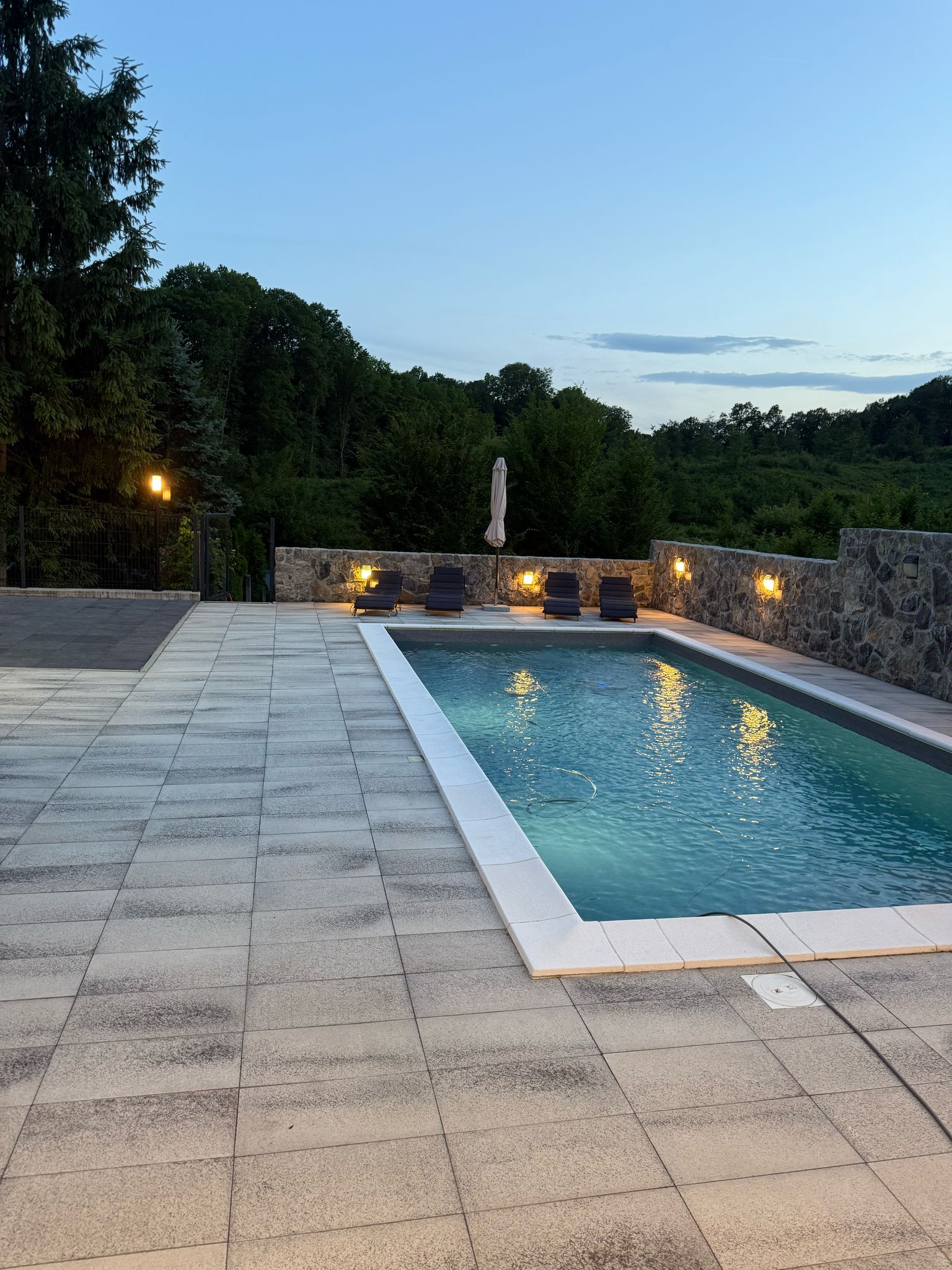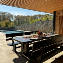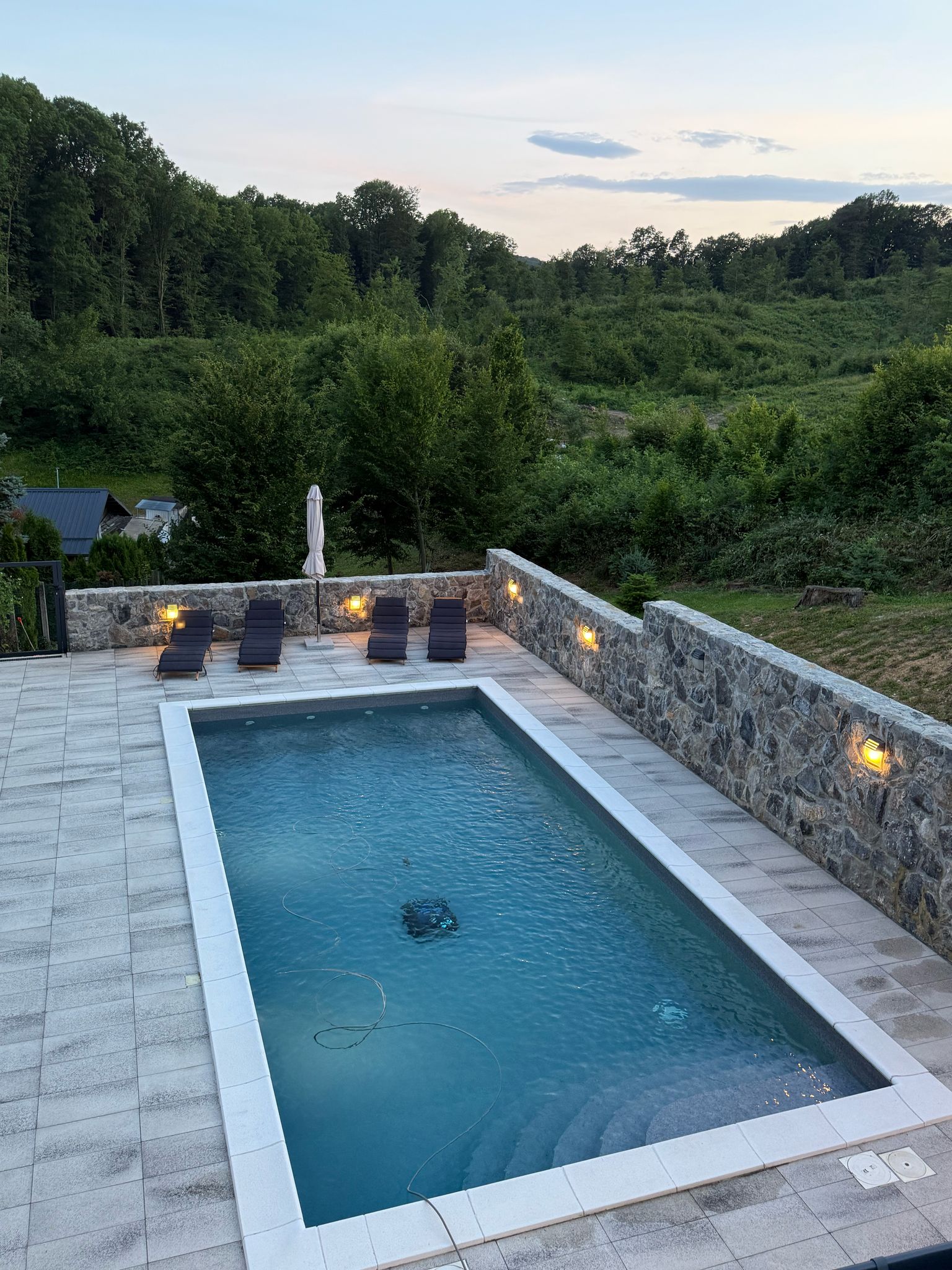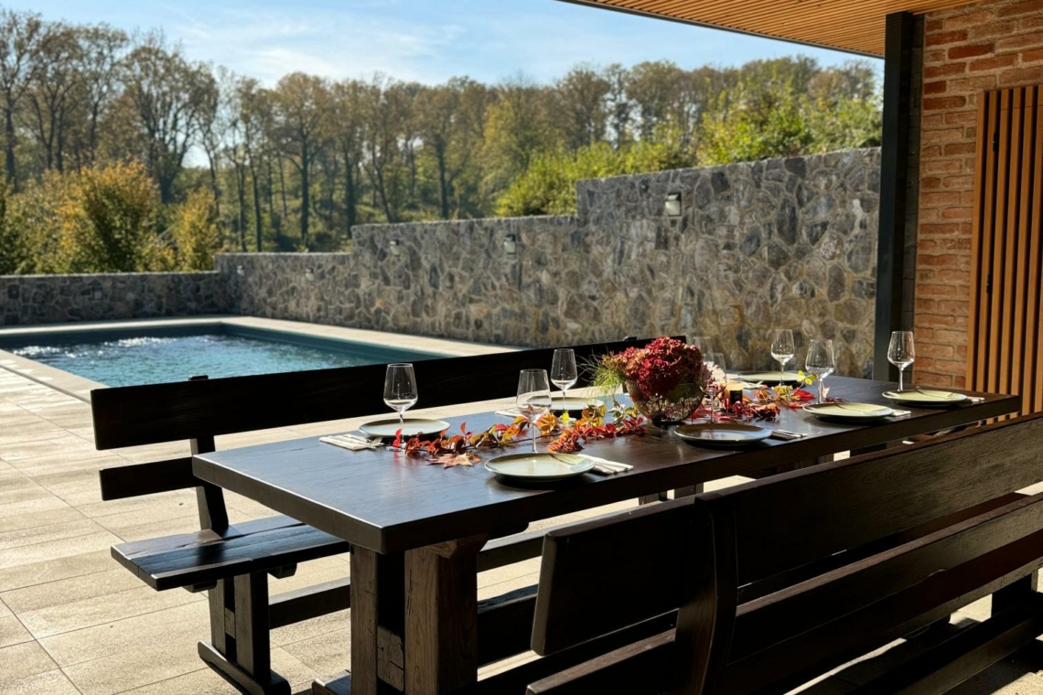 Outside, guests can enjoy a 32 m² private swimming pool, sun loungers, and scenic views of the surrounding greenery. Children will love the playground with a slide. The covered terrace with a wood-fired grill and summer kitchen is ideal for relaxing evenings.