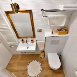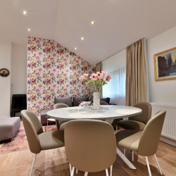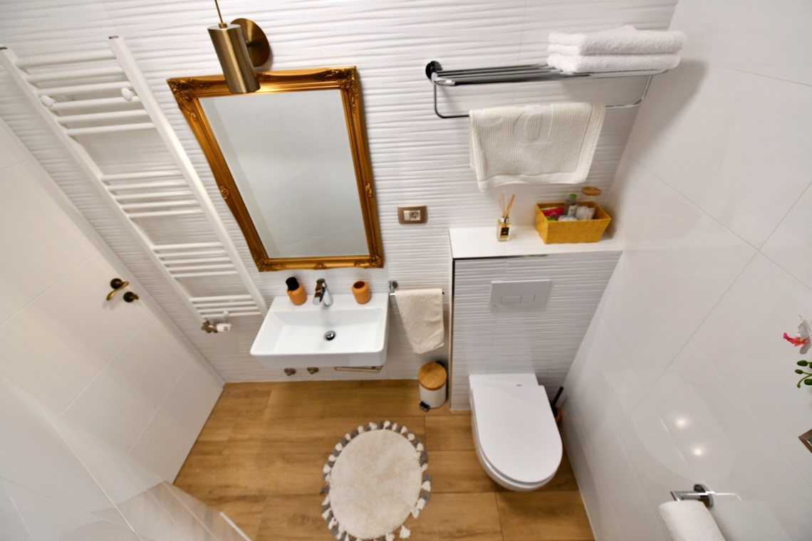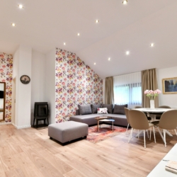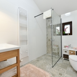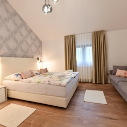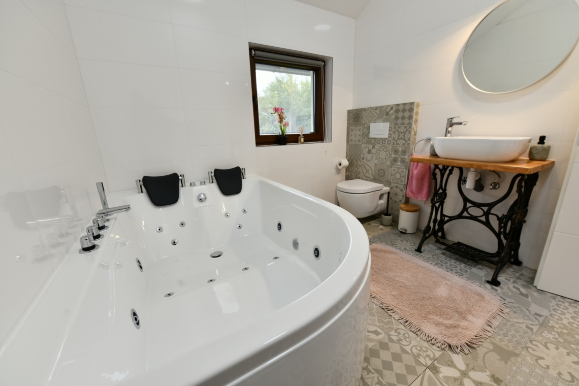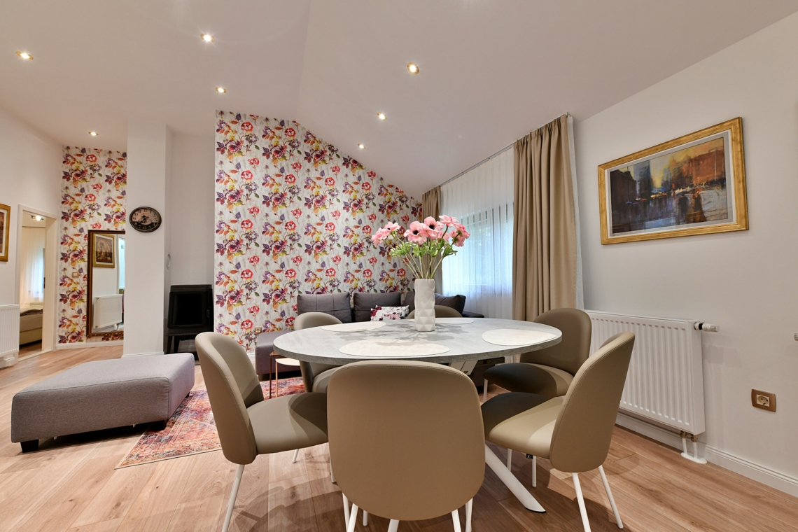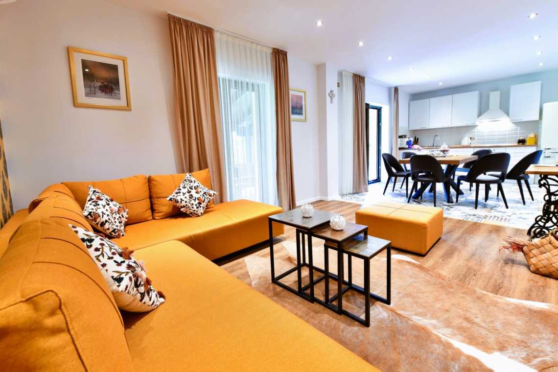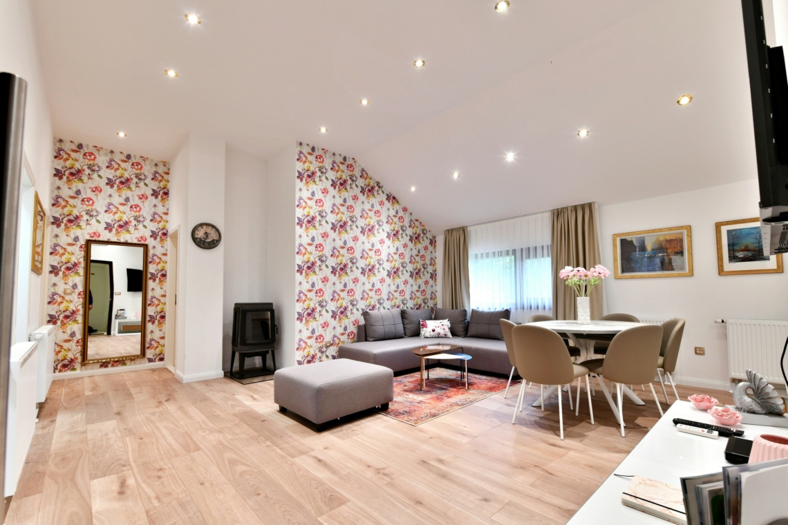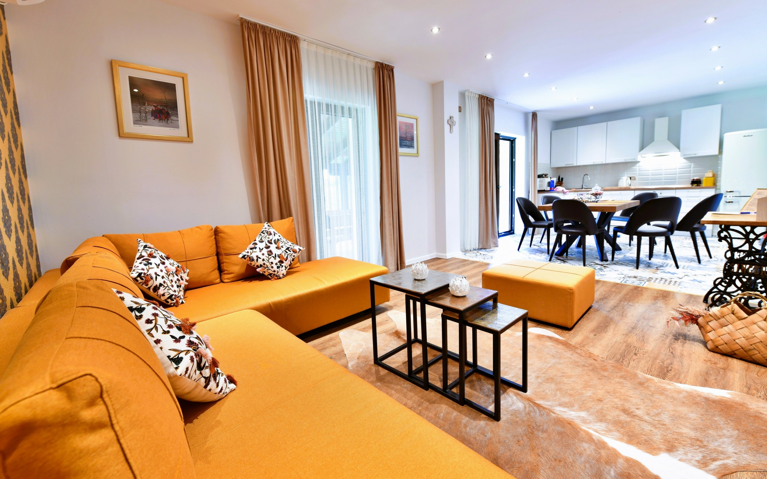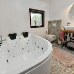 Apartman broj 2 površine 86 m2, dvije velike obiteljske sobe, dvije kupaonice, u jednoj Jacuzzi za dvije osobe, potpuno opremljena kuhinja s blagovaonicom te veliki dnevni boravak.