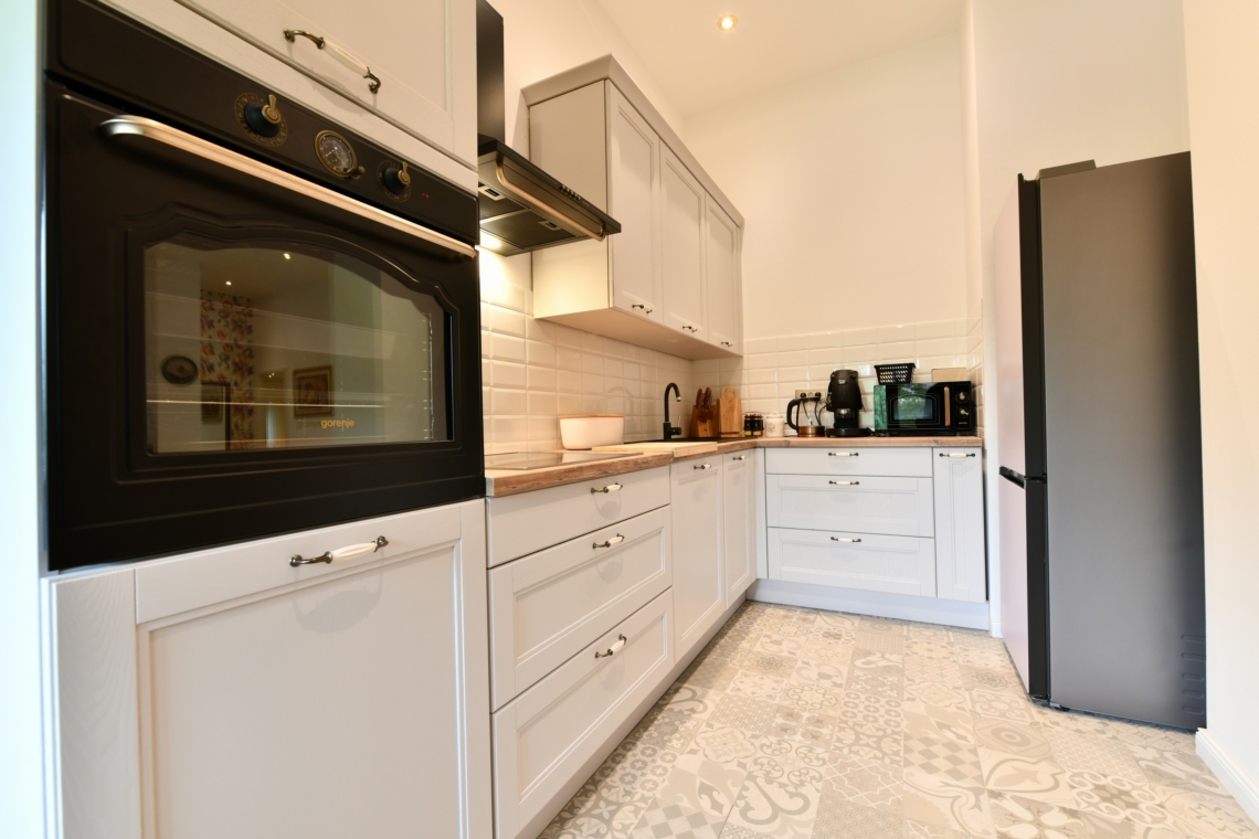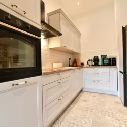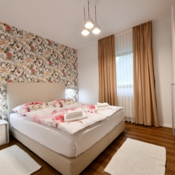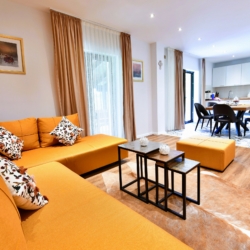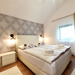 Sastoji se od dva apartmana : apartman broj 1 površine 65m2 + natkrivena terasa s roštiljem 40 m2, dvije spavaće sobe te kupaonica i wc zasebno s toaletnim potrepštinama te veliki dnevni boravak i potpuno opremljena kuhinjom (perilica posuđa, pećnica, mikrovalna, aparat za kavu…) s blagavaonicom.