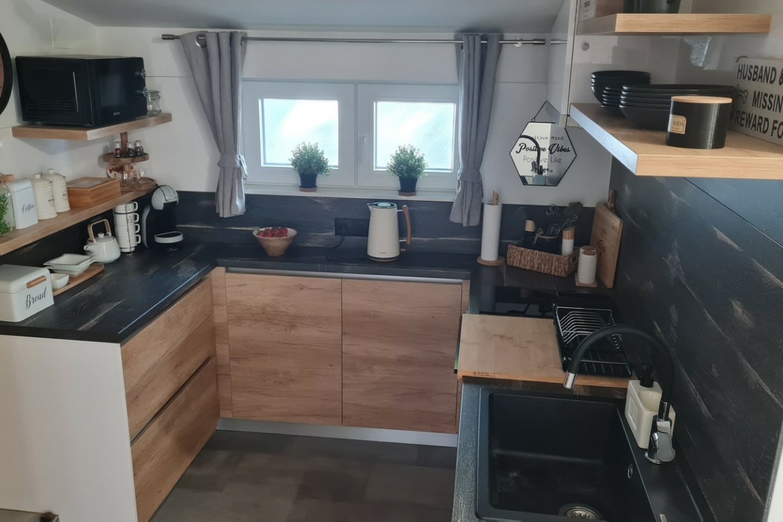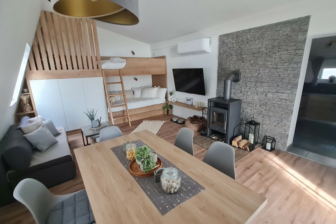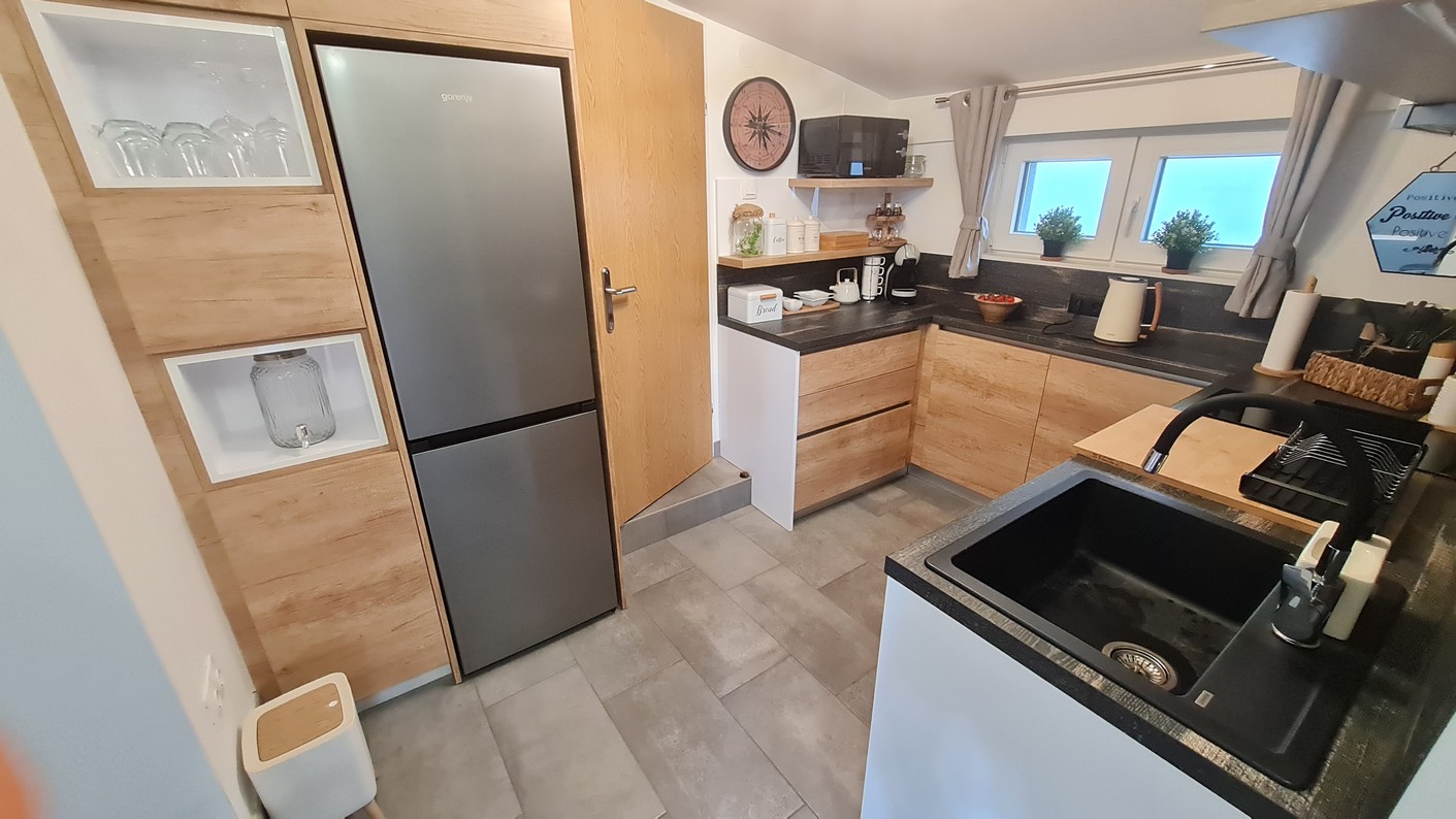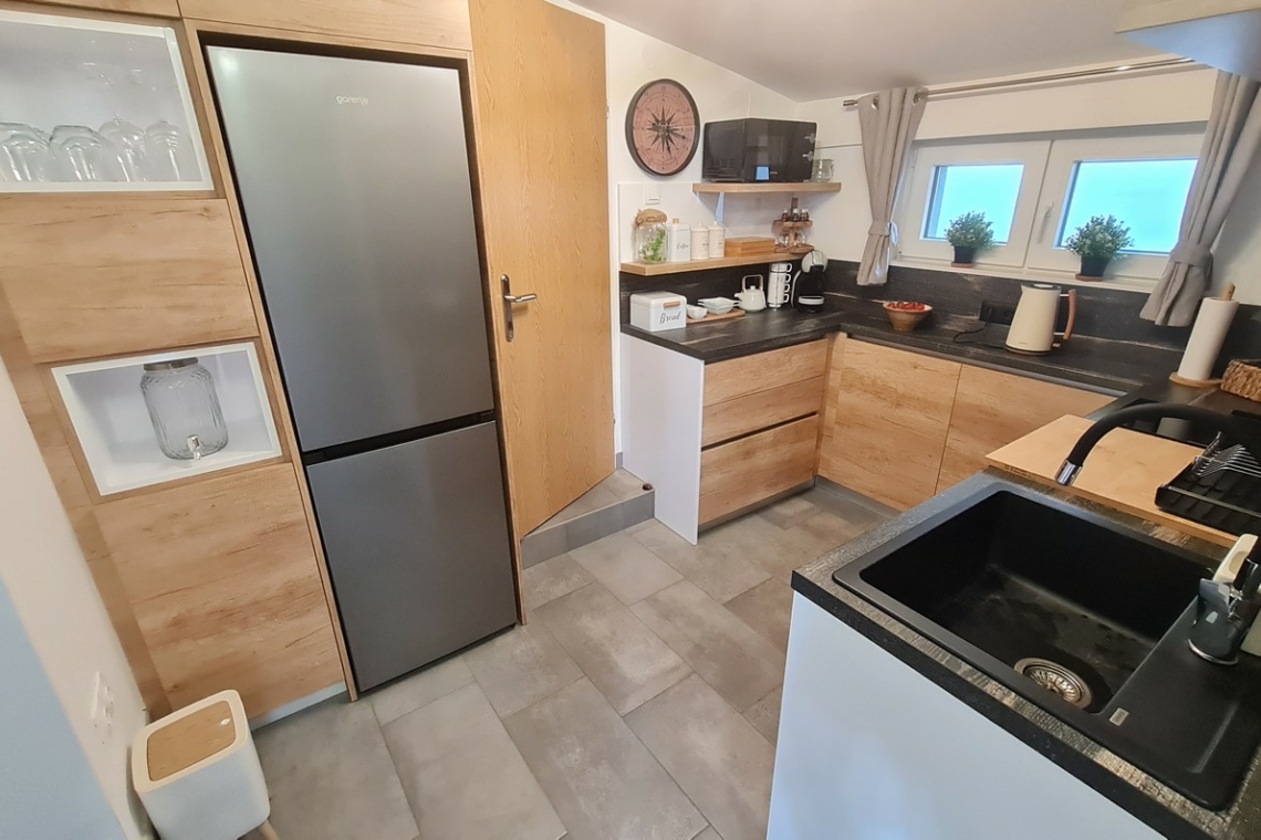 Kuća ima jednu spavaću sobu s bračnim krevetom, idealnu za ugodne i romantične večeri. Dnevni boravak elegantno je uređen s modernim krevetom na kat, što je čini savršenom za obitelji s djecom ili grupu prijatelja. Tu je i moderno uređena kuhinja sa svim potrebnim aparatima za pripremu omiljenih jela, kao i moderna kupaonica s tušem i svim toaletnim potrepštinama.