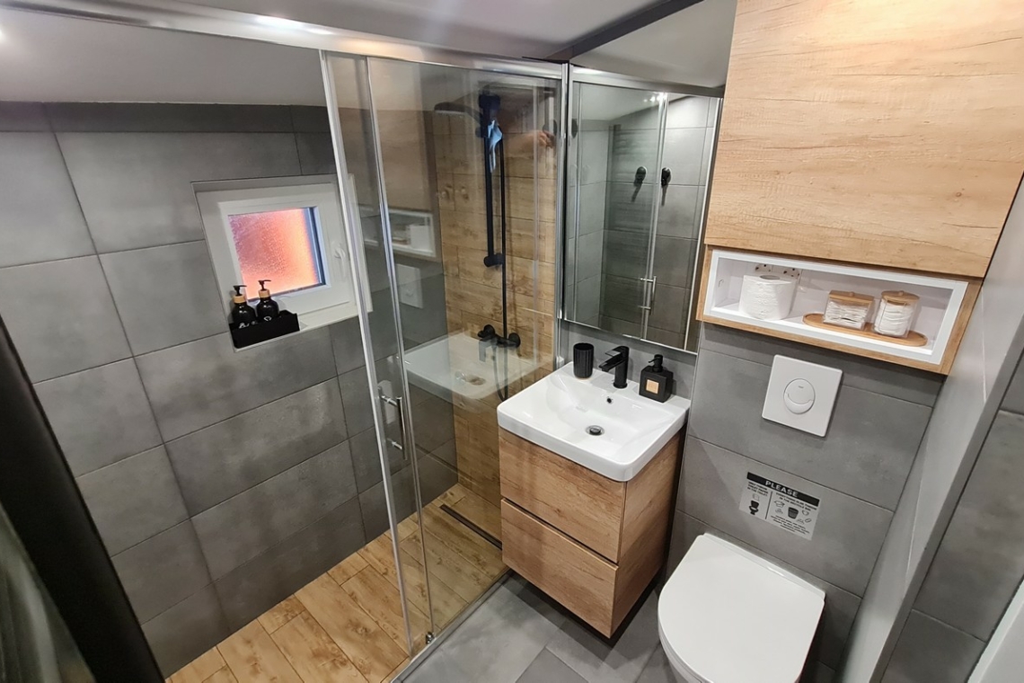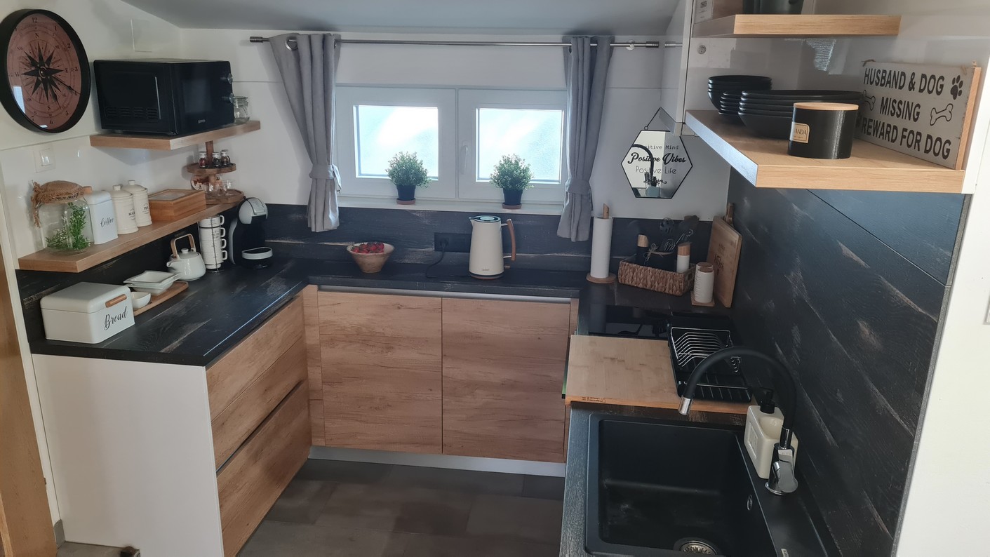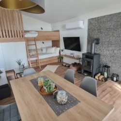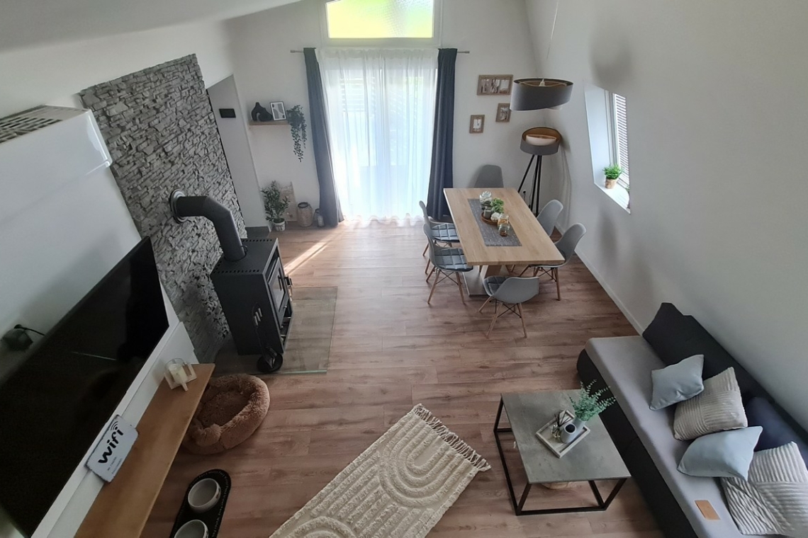 Kuća ima jednu spavaću sobu s bračnim krevetom, idealnu za ugodne i romantične večeri. Dnevni boravak elegantno je uređen s modernim krevetom na kat, što je čini savršenom za obitelji s djecom ili grupu prijatelja. Tu je i moderno uređena kuhinja sa svim potrebnim aparatima za pripremu omiljenih jela, kao i moderna kupaonica s tušem i svim toaletnim potrepštinama.