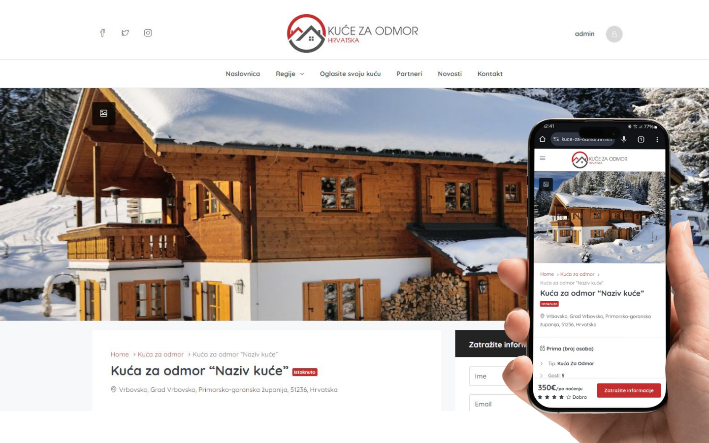 Dobrodošli na Kuće za odmor Hrvatska, centralnu platformu za oglašavanje kuća za odmor diljem Hrvatske! Na našoj platformi otvoreni smo za iznajmljivače iz svih krajeva – od pitome Slavonije, preko slikovite Istre i Kvarnera, pa sve do sunčanog Dubrovnika. Bez obzira na to gdje se nalazi vaša kuća za odmor, ovo je pravo mjesto za promociju vašeg objekta i privlačenje gostiju iz Hrvatske i cijeloga svijeta.