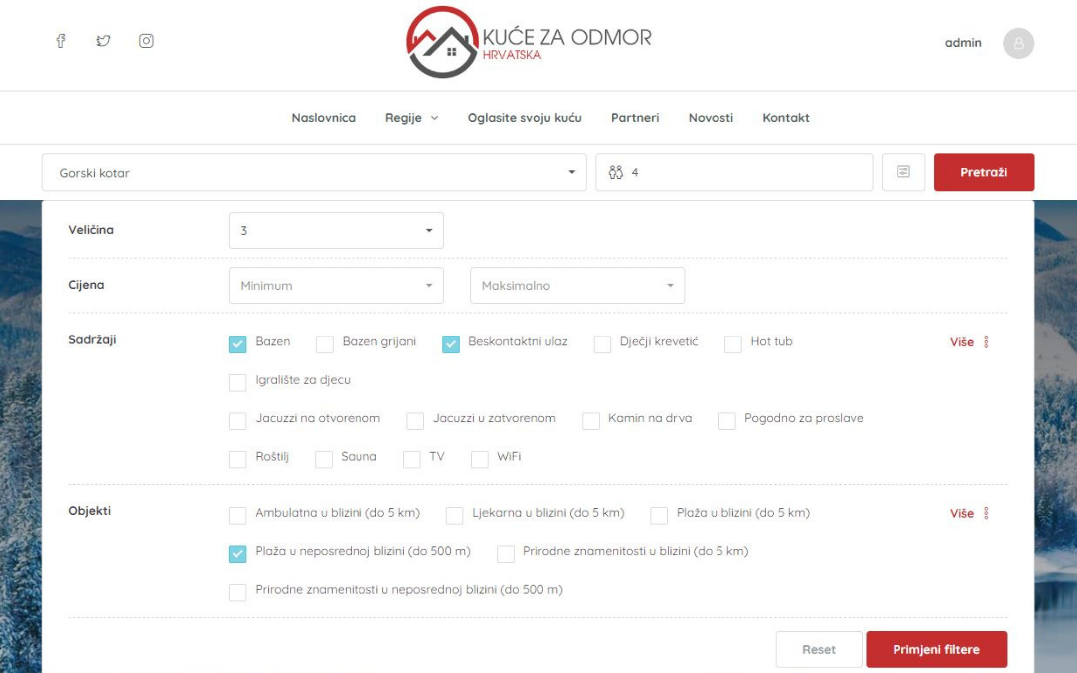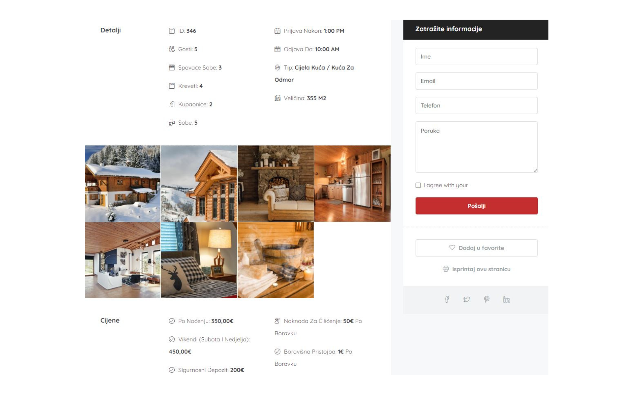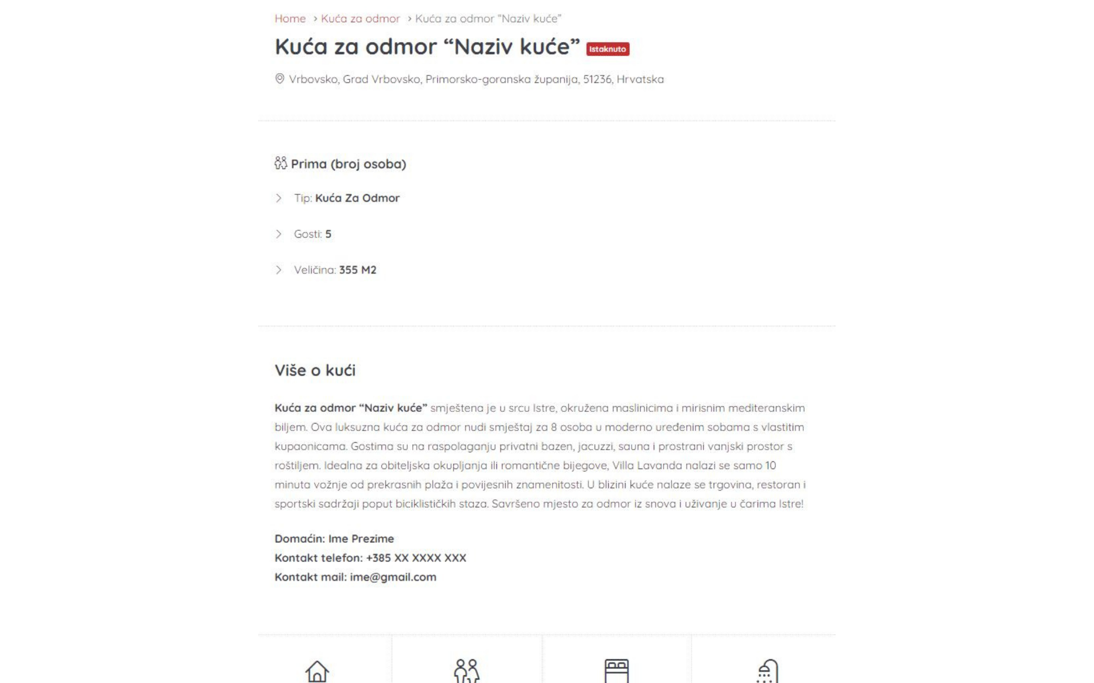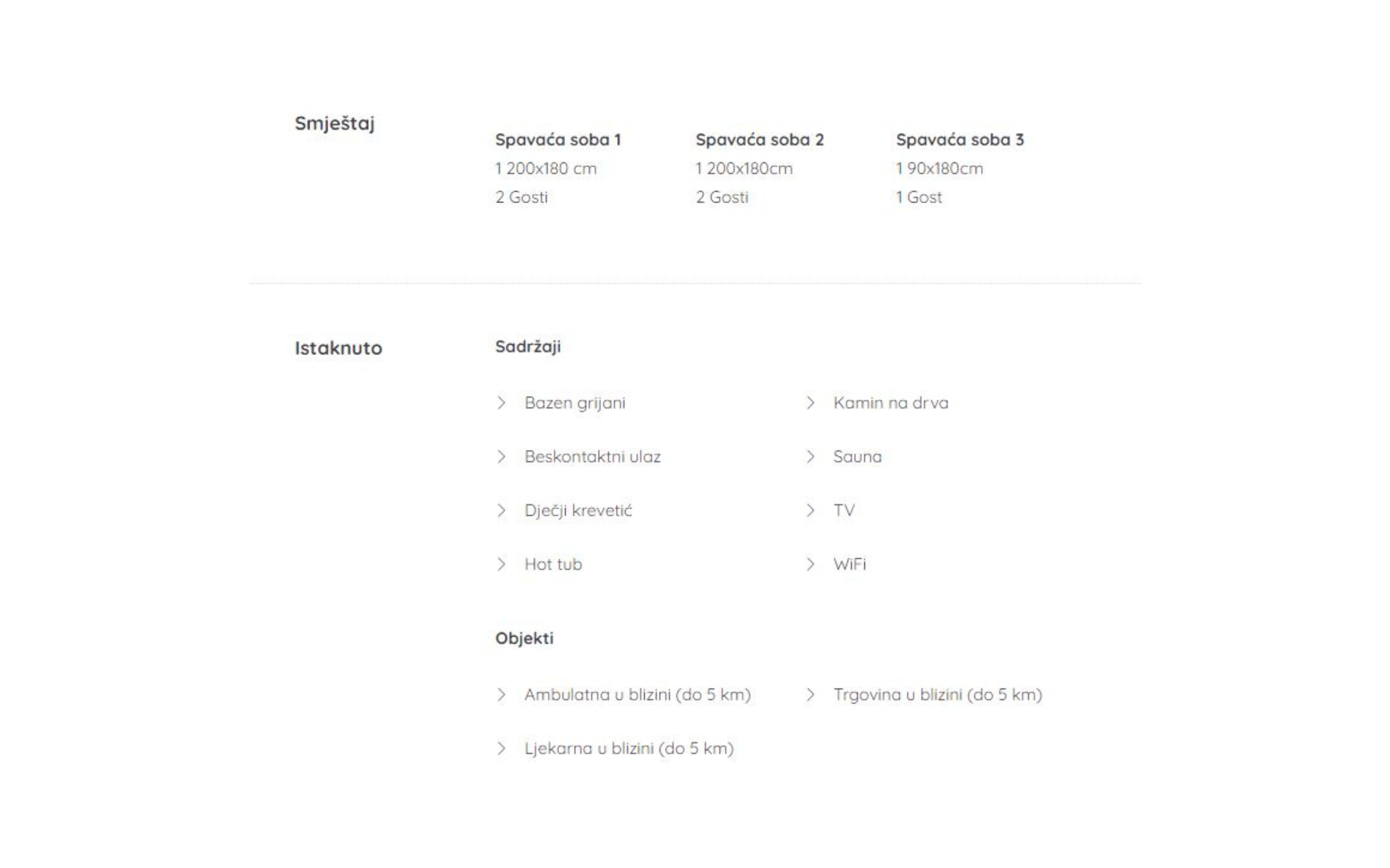 Omogućujemo gostima da brzo pronađu idealnu kuću na temelju sadržaja poput bazena, jacuzzija, roštilja, broja soba, blizine plaža, trgovina ili sportskih atrakcija. To skraćuje tok komunikacije i štedi vaše vrijeme.